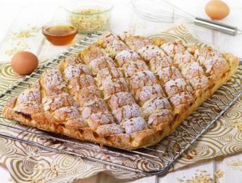 - Anschließend den Kuchen am Blech abkühlen lassen. Unmittelbar vor dem Servieren dünn mit Staubzucker bestreuen, mit Honig beträufeln und mit den gehobelten Mandeln bestreuen.